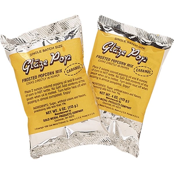 Add the contents of 1 pouch of caramel glaze pop to a 6 or 8-ounce popcorn kit (oil popcorn and seasoning) to make a perfect batch of caramel corn. For best results clean kettle after making a batch of caramel corn. Packed (48) 4-ounce pouches of glaze per case.