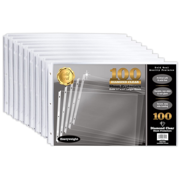 100 Pack 11x17 Inch Heavyweight Diamond Clear Sheet Protectors, Side Loading, Ledger Sheet Protectors, by Gold Seal, 3-Hole Punched