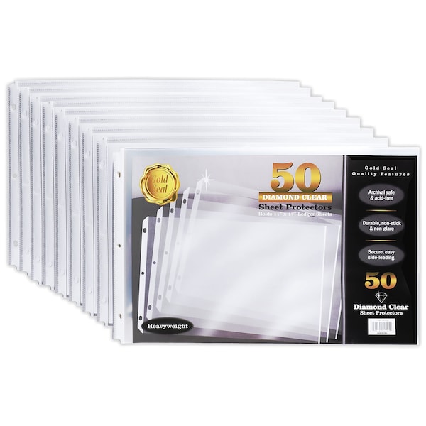 50 Pack 11x17 Inch Heavyweight Diamond Clear Sheet Protectors, Side Loading, Ledger Sheet Protectors, by Gold Seal, 3-Hole Punched