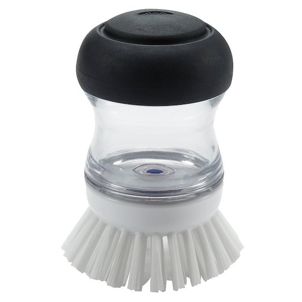 Dispense soap on demand with our soap dispensing palm brush. With a light push of the button, soap shoots out and onto the item being scrubbed. Contoured shape for optimal comfort and scrubbing power. Durable nylon bristles are safe for non-stick cookware and bakeware.