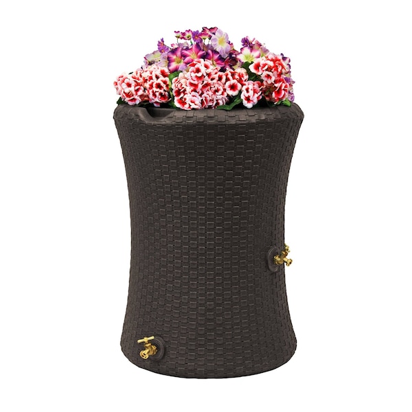 The Impressions Nantucket 50 Gallon Rain Saver is one of the sturdiest and most eye-catching rain barrels on the market. It features a one-of-a-kind wicker design that will never unravel or fray, and with a deep welled top, you can plant an array of flowers or even a small herb or vegetable garden. The top also includes the Good Ideas original, integrated channel that automatically diverts overflow to the front of the barrel and keeps your foundation from flooding. The large opening allows use with both 2x3 or 3x4 downspouts and is covered with a soft, fine mesh, plastic screen to keep out heavy debris. Also included with the barrel are two sturdy metal spigots to install in the offset spigot locations.