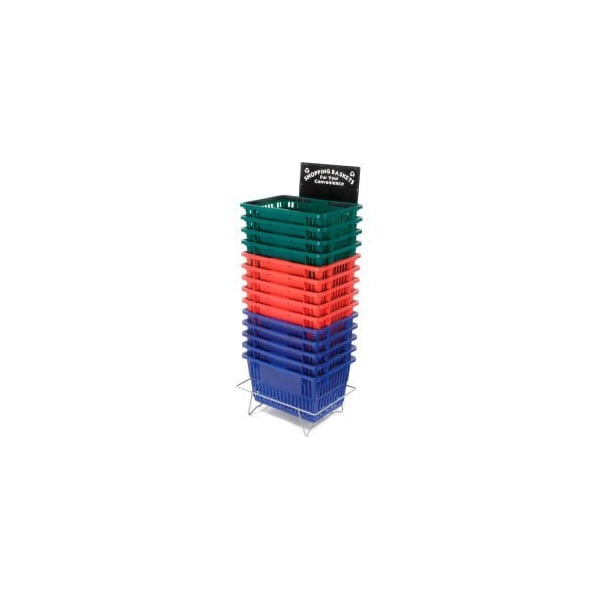 GOOD L CORP. ® SHOPPING BASKET STAND WITH BLACK SIGN WIRE RACK HOLDS MULTIPLE NESTING BASKETS TO CONVENIENTLY PLACE SHOPPING CONTAINERS IN ONE PLACE. PROVIDES A PICK-UP AND DROP-OFF STATION FOR SHOPPING BASKETS. RACK INCLUDES A SNAP-ON SIGN, WHICH STATES "SHOPPING BASKETS FOR YOUR CONVENIENCE" FOR EASY IDENTIFICATION. GROCERY SHOPPING BASKET RACK HOLDS UP TO 36 WIRE BASKETS, 20 STANDARD BASKETS OR 18 LARGE BASKETS.