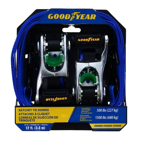 Goodyear 12foot 1500lb Ratchet Tie Down Standard Duty. 12Ft length 1500lb break strength. 500LB working load. Intended for everyday use and lighter load options. Ideal for use with small trailer loads ATVs tractors and dirt bike use.