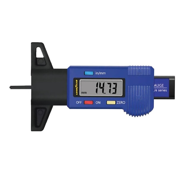 Goodyear Professional Digit Tread Depth Gauge accurately measure tread depth in either mm or inches. Includes large LCD screen for increase visibility and rubberized grip. Zero setting at any position. Suitable for thread depth brake shoe and pad wear. Includes on and off button switch. Works for passenger vehicles motorcycles trucks and SUVS. Includes 1X LR 44 Button Battery.