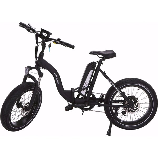 The Comfortable Cruiser The GoCruiser is an ideal source for all your travels and getaways. Designed to be comfortable and to get on easily, the step thru frame made of a 6061 aluminum alloy is our lowest height model, this e-bike is extremely versatile with different modes to select from such as pedal assist, electric throttle, manual pedal or walk mode. It includes fat tires with a top speed of 20MPH and can go a distance range of 18 miles (electric) or 36 miles (pedal assist) on a single charge. MOTOR: 750 W Motor BATTERY: 48V10ah Lithium Battery CHARGE TIME: 4 Hours TOP SPEED: 20 MPH DISTANCE RANGE: 20 miles (electric only) , 36 miles (pedal assist) DISPLAY: LCD 48V 5 Level PAS SW900 PEDAL ASSIST: 1-5 WEIGHT CAPACITY: 300lbs TIRES: 20 x 4.25 FRAME SIZE: 16 " Note: The bike comes approximately 90% assembled. SAFETY FEATURES: LED headlight and taillight controlled by the LCD, Front and Rear Disc Brakes, and Fat tires. Twist grip throttle Weight capacity: 300 LBS Display: Speedometer, odometer, pedal asist level, battery gauge, and USB charging allowing you to charge your gadgets while riding PERFECT USE FOR: Perfect blend of city and adventure DURABLE FOLDABLE FRAME: 6061 Aluminum Alloy folding frame, with folding pedals for easy storage ADJUSTABLE: Seat adjusts to riders with a height of 4'10" and taller 4 MODES: Pedal Assist, Electric, Manual, or Walk mode COMFORT: Shimano 7 speed derailleur, front shock suspension, quick release axle on front wheel, and dual layered seat saddle to ensure a comfortable ride.
