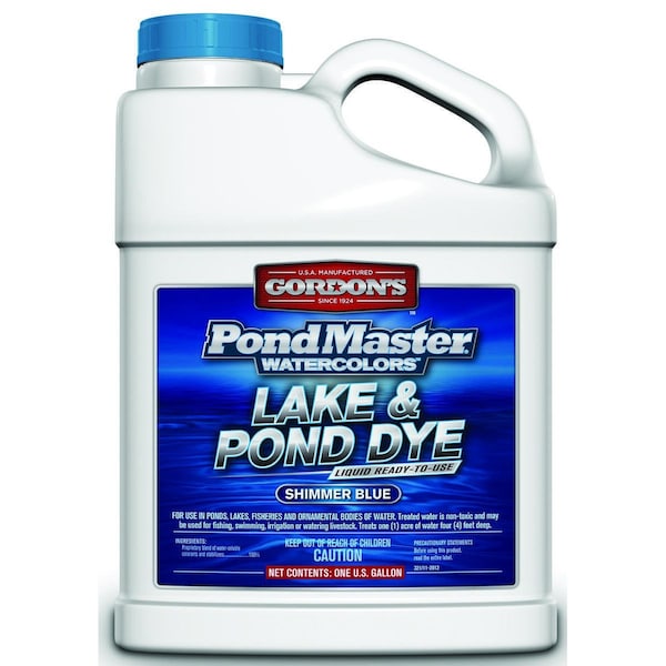 PONDMASTR SHIMMER BLUE GALLON PondMaster Watercolors Lake and Pond Blue Dye. Controls common algae species in ponds and lakes while coloring the water a beautiful aqua blue. Can be used in natural and manmade ponds and lakes, fish farms and fish hatcheries. Colorants resistant to wavelength of sunlight to control algae. Will not harm fish or livestock when used as directed.