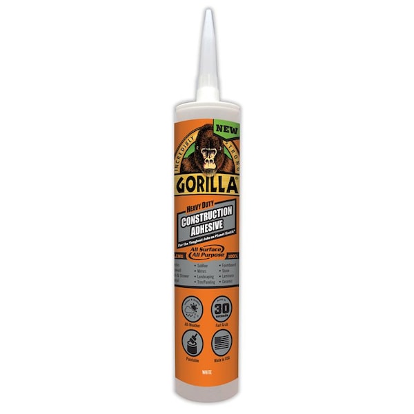Gorilla Heavy Duty Construction Adhesive is a tough, versatile, all-weather adhesive. Unlike other construction adhesives, its 100% adhesive formula provides a long-lasting, heavy duty bond. We call it All Surface, All Purpose. The gap-filling, durable, 100% waterproof formula is perfect for indoor and outdoor projects, holds in 30 seconds, and bonds virtually anything including subfloor, mirrors, trim, drywall, landscaping, bath surrounds, foamboard, marble and more!