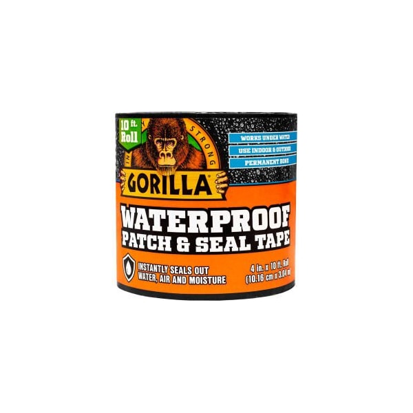 GORILLA WATERPROOF PATCH & SEAL TAPE, 4" X 10 FT. GORILLA WATERPROOF PATCH & SEAL TAPE INSTANTLY SEALS OUT WATER, AIR AND MOISTURE. WITH AN EXTRA THICK ADHESIVE LAYER AND UV RESISTANT BACKING THIS TAPE CONFORMS TO FORM A PERMANENT BOND INDOORS AND OUT. AT 4" WIDE USE IT TO PATCH HOLES, CRACKS, GAPS AND TEARS, EVEN UNDERWATER. EXCELLENT FOR HOME, AUTO, MARINE, CAMPING, RVS, OUTDOORS AND MORE!! FEATURES: