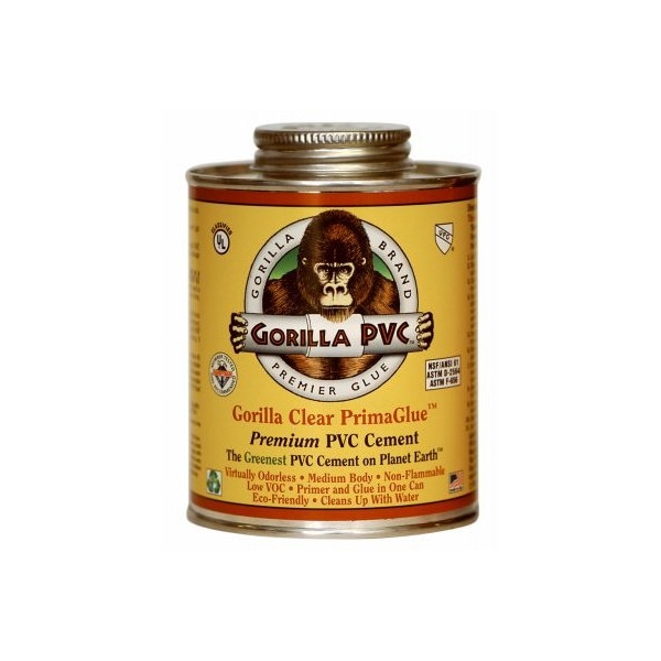 Gorilla PrimaGlue, 8 OZ, Clear, PVC Glue, Strong PVC Cement Solvent, No Odor, NonFlammable, Flammable So Ships Safely, Meets Or Exceeds ASTM IAPMO RT Standards, Use As Cement, Primer Glue, Cleans Up With Water, EcoFriendly, Low VOC, UnCured NMP Solvent Is Biodegradable