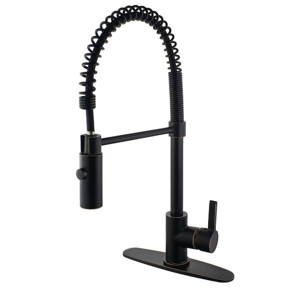 Transcend your home into a futuristic utopia with this faucet's brilliant craftsmanship and modern, curved spout with ergonomic levers. Designed for optimum versatility and functionality, the multiple spray settings and extendable spout of this pre-rinse faucet make for an enjoyable cleaning experience. Additionally, the rotating swivel spout leaves no area of the sink untouched as the industrial look of the exposed spring provides residential function. The naples bronze finish will also provide a long lasting and warm touch to your kitchen ensemble. Matching accessories are available for use.