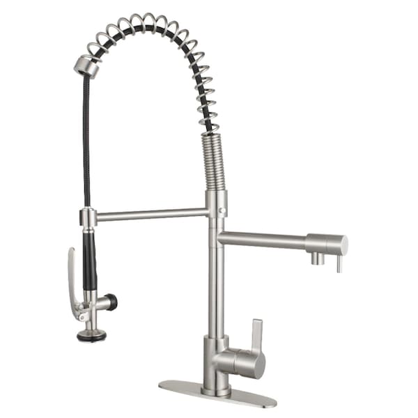 Transcend your home into a futuristic utopia with this faucet's brilliant craftsmanship and modern, curved spout with ergonomic levers. Designed for optimum versatility and functionality, the multiple spray settings and extendable spout of this pre-rinse faucet make for an enjoyable cleaning experience. Additionally, the rotating swivel spout leaves no area of the sink untouched as the industrial look of the exposed spring provides residential function. The brushed nickel finish will also provide a long lasting and warm touch to your kitchen ensemble. Matching accessories are available for use.
