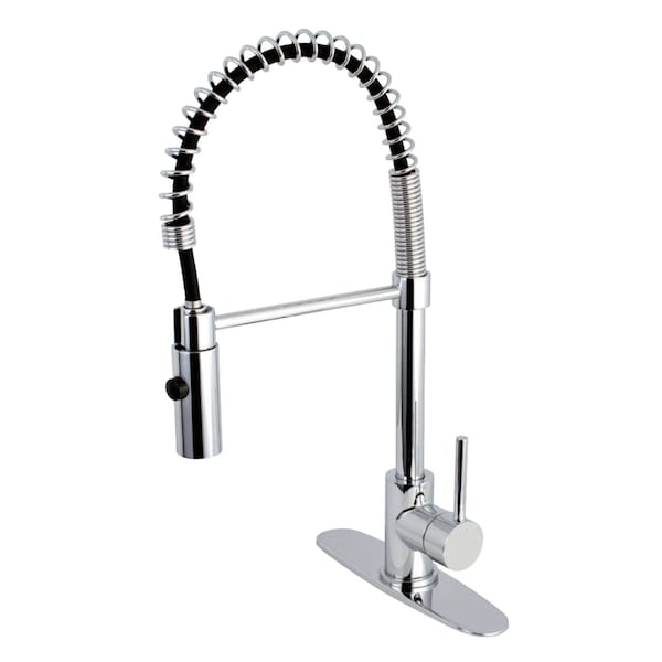 This faucet boasts bold, sleek design with its cylindrical styling. Designed for optimum versatility and functionality, the multiple spray settings and extendable spout of this pre-rinse faucet make for an enjoyable cleaning experience. Additionally, the rotating swivel spout leaves no area of the sink untouched as the industrial look of the exposed spring provides residential function. The polished chrome finish will also add a glistening elegance to your kitchen ensemble. Matching accessories are available for use.