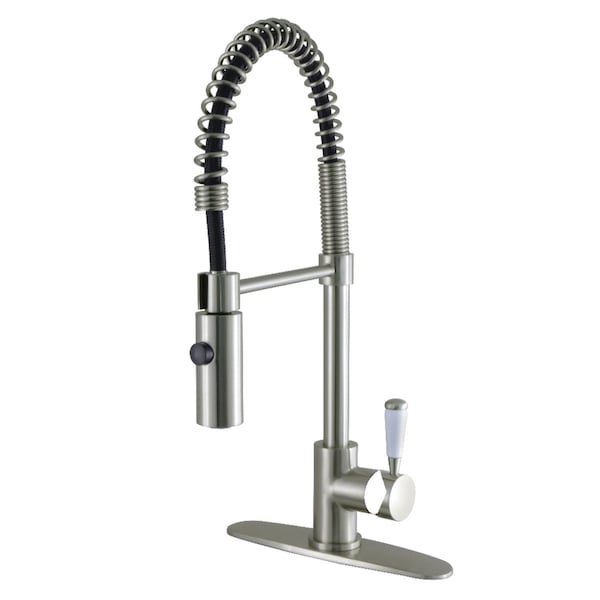 Crafted to bring aesthetic beauty alongside exceptional performance, the feature of porcelain lever handles and rounded architecture solidifies pristine refinement in this faucet. Designed for optimum versatility and functionality, modern day technology is provided for a state-of-the-art product. The Paris single-handle pre-rinse kitchen faucet features a high arching spout to easily clean larger dishes, swivel ability to reach any area in and around your sink, and a dual function pull-down sprayer to tackle tough messes. Matching accessories are available for use.