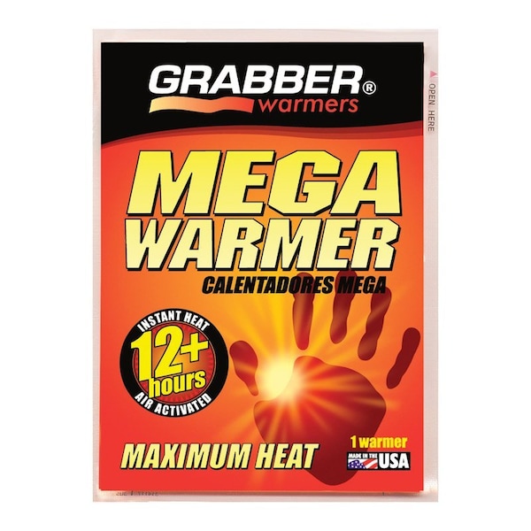 Grabber Mega Warmers are rectangular shaped single-use air-activated heat packs that are larger and last longer than standard heat packs. They provide 18 hours of continuous warmth for the hands and body.