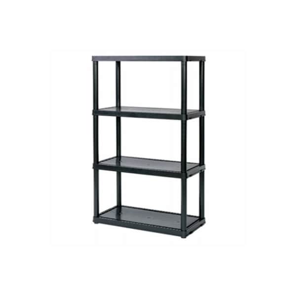 12Wx24Lx48H, Black, 4 shelf, light duty plastic shelving unit Holds 55 lb per shelf, 220 lb per unit Can interconnect with multiple units for added storage space Ideal for garage, basement, utility room, laundry room or anywhere storage is required