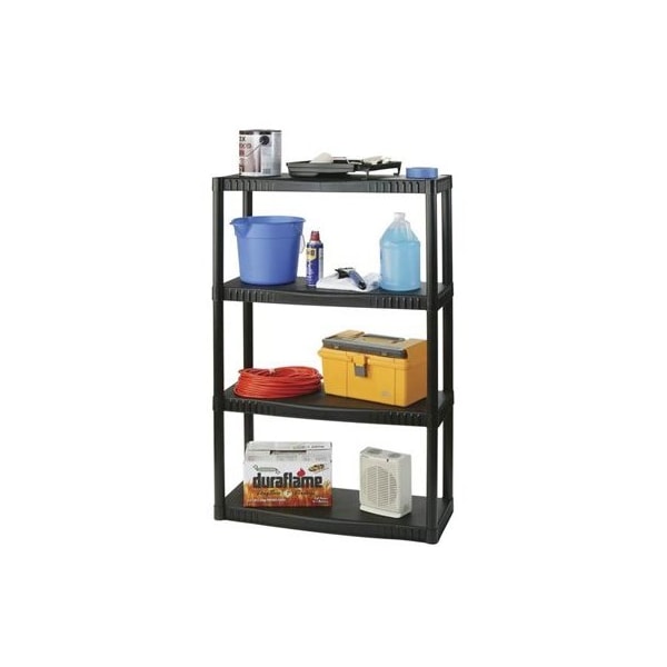34Wx14Lx55H, Black, 4 shelf, medium duty plastic shelving unit Has ventilated shelves Holds up to 400 Lbs Each shelf holds 100 Lbs Can interconnect with multiple units for added space Ideal for garage, basement, utility room, laundry room or anywhere storage is required Wall brackets included
