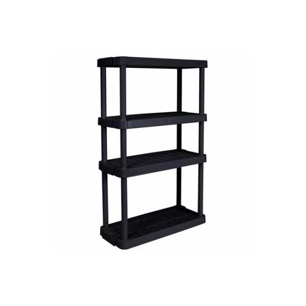 14Wx32Lx545H, Black, 4 shelf adjustable, medium duty, shelving unit Has ventilated shelves Each shelf holds up to 150 Lbs Holds up to 600 Lbs per unit Utilizes slide and lock technology to easily adjust shelves Can interconnect with multiple units for added storage space Ideal for garage, basement, utility room, laundry room or anywhere storage is required Wall brackets included