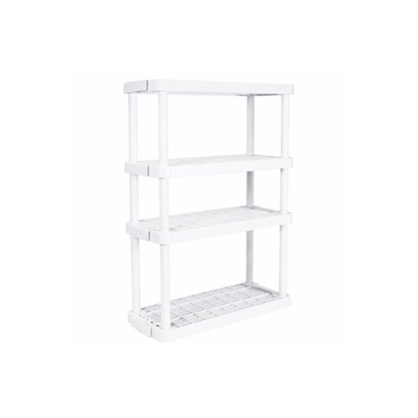14Wx32Lx545H, White, 4 shelf adjustable, medium duty, shelving unit Has ventilated shelves Each shelf holds up to 150Lbs Holds up to 600Lbs per unit Utilizes slide and lock technology to easily adjust shelves Can interconnect with multiple units for added storage space Ideal for garage, basement, utility room, laundry room or anywhere storage is required Wall brackets included