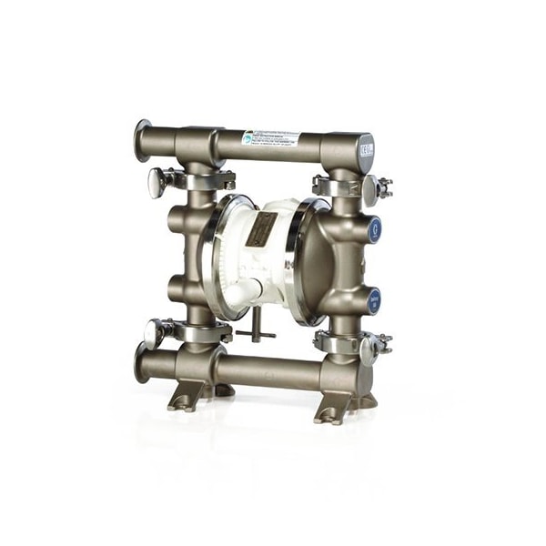 Food Grade AODD Pump, Air Consumption (Maximum) 28 scfm, Air Intake Connection Size 1/4 in, Air Intake Connection Type NPT, Check Seat Material Stainless Steel, Diaphragm Material Santoprene, Feet of Head (Maximum) 230.7 ft, Flow Rate (Maximum) 16 gpm, Manifold Connection Single Port, Media Discharge Connection Size 1 in, Media Discharge Connection Type Tri-Clamp, Media Discharge Location Side, Top, Media Intake Connection Size 1 in, Media Intake Connection Type Tri-Clamp