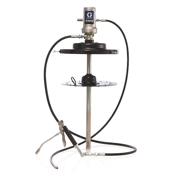 GRACO 24J036 LD Series 50: 1 120 lb. Grease Pump - Stationary Package Stay ahead of the competition with LD Series pumps. These affordable and full-featured pumps are designed for lower-volume up to 7,000 lb./year 3175 kg./year applications. LD pumps are fine-tuned for a compact, flexible and durable solution. Three Inch Air Motor - Provides more power to create better flow. Engineered for Durability - Patented cup and plate design eliminates the need for O-rings that wear out faster for a more durable, longer-lasting solution. Modular Air Valve - Air inlet and exhaust locations are easy to configure with just four bolts for simple, hassle free installations. Pilot Valves - Patented self-cleaning design increases reliability in dirty air environments and minimizes pressure drop with rapid changeovers for reduced stalling and smoother flow. Includes: 24G603 LD Grease Pump 24H862 Hose Kit Grease hose 1/4in x 6ft Air/Water hose 3/8in x 6ft 24F902 Follower Plate 24F905 Drum Cover 129581 Grease Valve 129591 Z-Swivel Specifications: Air Inlet Size in 0.25 Application Grease Compatible Material Grease Fluid Outlet Size in 1/4 Maximum Working Pressure MPa 35 Maximum Working Pressure psi 5000 Power Type Pneumatic Pump Ratio 50: 1 Type Piston Pump Package Wetted Material Steel, Brass, Nitrile Rubber, Polyurethane, UHMWPE, Acetal