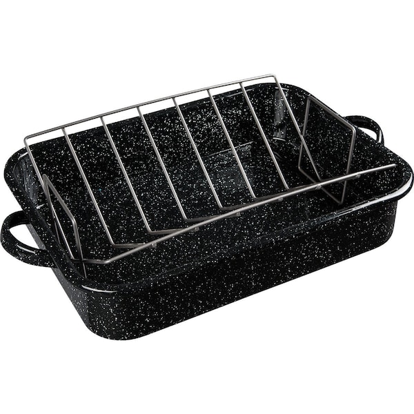 Rectangular Open Roaster with V-Rack features carbon steel construction for strength durability and even heat distribution. The porcelain surface is naturally nonstick and contains no harmful chemicals that change the taste color or nutritional value of food. High heat metal tools and dishwasher safe. The roaster has built-in handles for easy lifting.