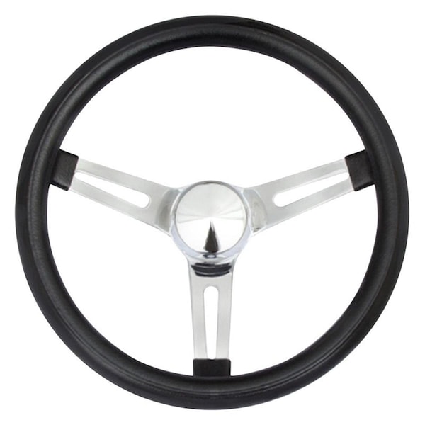 We strive to provide new innovative products to meet the need of the rapidly changing world we live in. Our goal is to provide products made with the finest material and consistent and high quality processes. Features -Vinyl grip -Crs steel spokes -Installation requires grant installation kit -Not designed for vehicles equipped with steering wheel airbags Specifications - Spoke Color: Chrome - Grip Color: Black - Grip Material: Foam - Shape: Round - Wheel Diameter: 13.50 - Country of Origin: Mexico