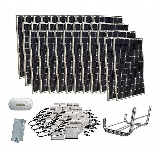 Solar Panel Kit, Number of Cells 60, Number of Solar Panels 32, Includes Flat Roof Mounting, (32) 265W Solar Panels Mfr. No. 31ED01, (32) Enphase Microinverters, (35) Trunk Cables, (2) Watertight Caps, (1) Enphase Envoy Monitor Gateway, (1) Midnite Mfr. No. MNPV3 Combiner Box, Unirac RM Ballasted Racking System with (45) Ballast Trays, (144) Module Clips, (144) Hex Bolts, Cell Type Monocrystalline, Open Circuit Voltage 38, Weight 2065 lb, Power Tolerance 0 Percent to +3 Percent