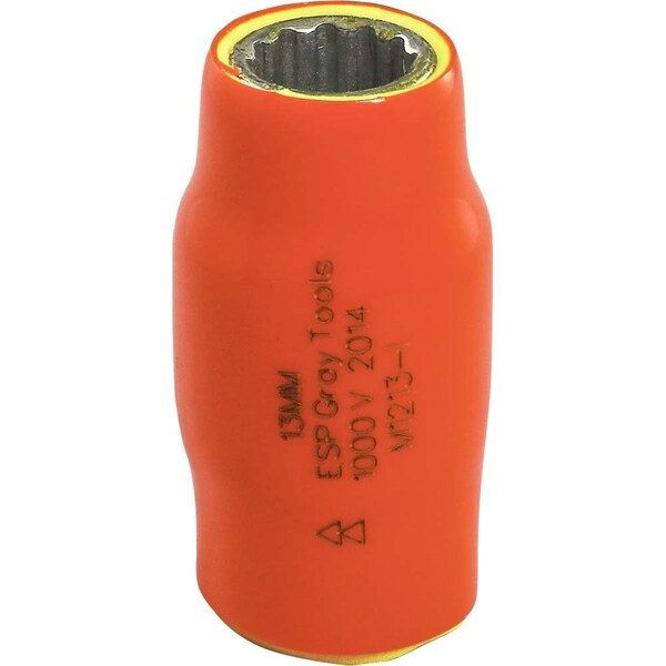 Hex Size: 13mm. Drive Type: 12 Point. Features an orange top insulation layer, and a second yellow layer that also serves as a visual safety indicator. Provides user protection for up to 1000 V. Individually insulated and tested to ASTM F1505 standards.