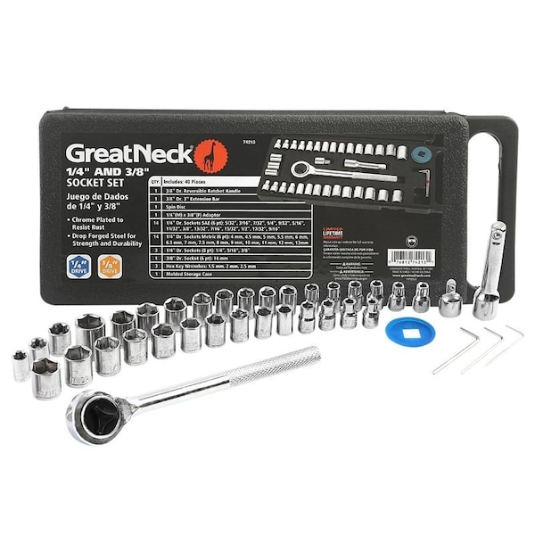 The GreatNeck 40-piece 1/4 in and 3/8 drive ratchet and socket set is ideal for the trunk of your car or any toolbox. Each set is triple chrome-plated to resist rust and made from drop-forged steel for strength and durability. Comes in a convenient blow mold storage case keeping everything organized. Contains both metric and SAE sizes.