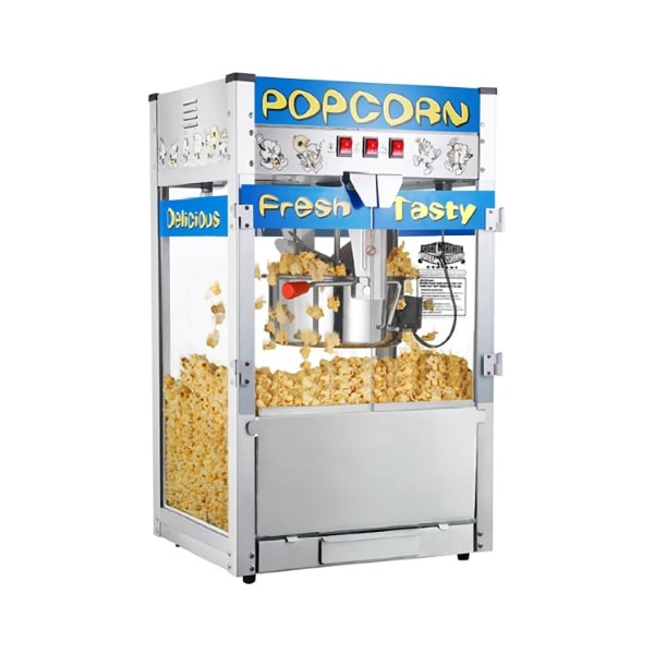 The 12-Ounce Popcorn Machine from Great Northern Popcorn will have you making movie theater style popcorn for movie nights at home, office gatherings and at birthday parties. This extra-large tabletop popcorn maker features an 12oz kettle, a warming deck, two tempered glass doors, an old maids' tray, stainless steel food areas and a modern design. This easy to operate popper makes roughly 5-gallons of hot and delicious popcorn per cycle which can be served in the included plastic tubs and popcorn bags.