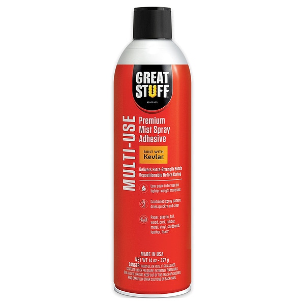 Mist Spray Adhesive, Adhesive Color Clear, Container Size 14 fl oz, Container Type Aerosol Can, Product Type Spray, Series Multi-Use, Spray Pattern Mist, Working Time 20 sec, Features Multi-Use, Full Cure Time 1 hr, Heat Resistant Yes, High Tack Yes, Interior/Exterior Interior/Exterior, Low Odor No, Materials Bonded Cardboard, Certain Foams, Cork, Foil, Leather, Metal, Paper, Plastic, Rubber, Vinyl, Wood, Maximum Application Temperature 85 Degrees F, Maximum Performance Temperature 122 Degrees F