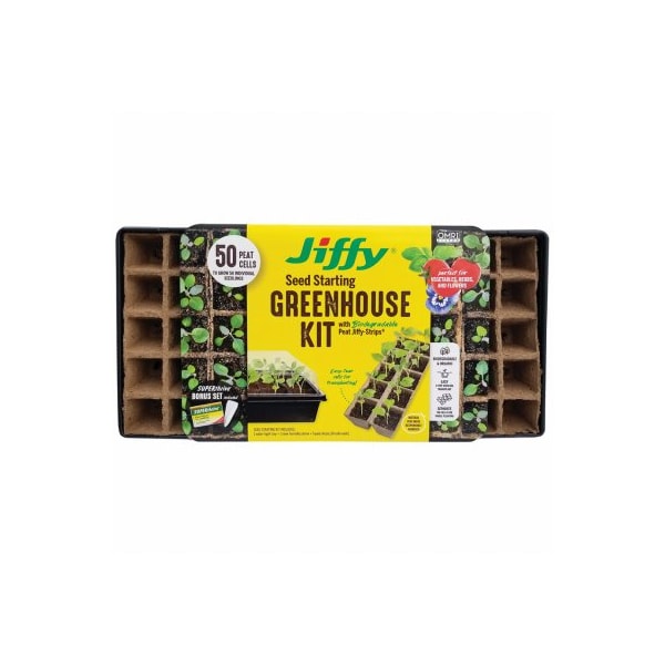 Jiffy Strips 'N Greenhouse, 50 Pack, 134 Square Jiffy Pots, 11 x 22, Tray Dome, Includes Superthrive A Kelp Based Vitamin For Plants Plant Markers