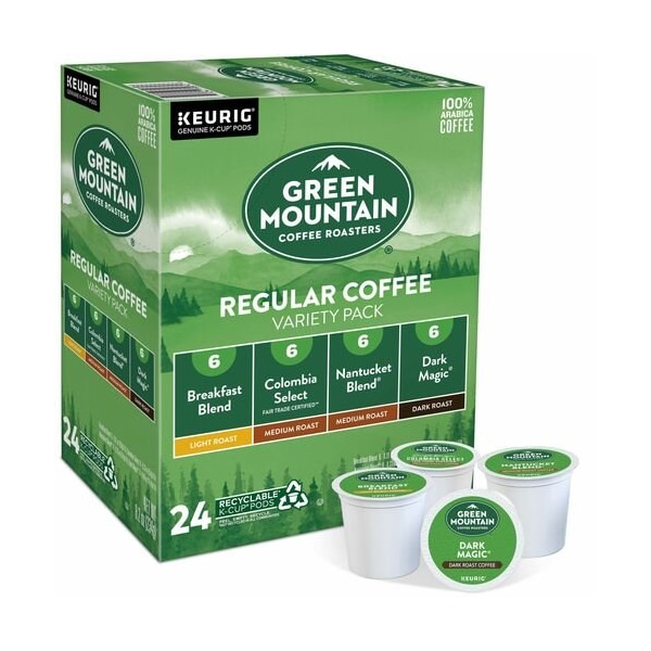 Choose the right brew for every time of the day with this coffee variety sampler. The dark roast delivers a bold sipping experience while the medium-roast options offer rich, full-bodied flavor. Prepare a cup of the light-roast recipe for a mid-afternoon cup of joe. All four are made of 100 percent Arabica coffee. Assortment includes Green Mountain Roasters Breakfast Blend, Colombia Select Fair Trade Certified, Nantucket Blend and Dark Magic. Breakfast Blend is a light roast with a bright, crisp and clean flavor. Colombia Select is a bright, balanced medium roast. Nantucket Blend, another medium roast, is full-bodied, complex and hearty. Dark Magic is a dark roast that is bold, deep and intense. Caffeinated coffee comes in airtight, recyclable K-Cups for single-cup brewing systems. K-Cups are easy to use. Simply shake and insert into your Keurig coffee brewer for a delicious cup of coffee.
