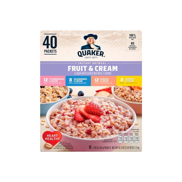 40 packets of quaker oats instant oatmeal in fruit and cream flavors, including 12 strawberries and cream, 8 blueberries and cream, 12 peaches and cream, and 8 bananas and cream. Quaker oats provide a good source of fiber to support a healthy digestive system. Quaker oats are 100 percent whole grain, low in saturated fat & cholesterol to help reduce the risk of heart disease. Made with no artifical preservatives, no artifical flavors, kosher friendly, 2 grams of fat per serving and only 110 calories per serving. Oatmeal is a great start to your morning to keep you energized, fueled and feeling good for the entire day.