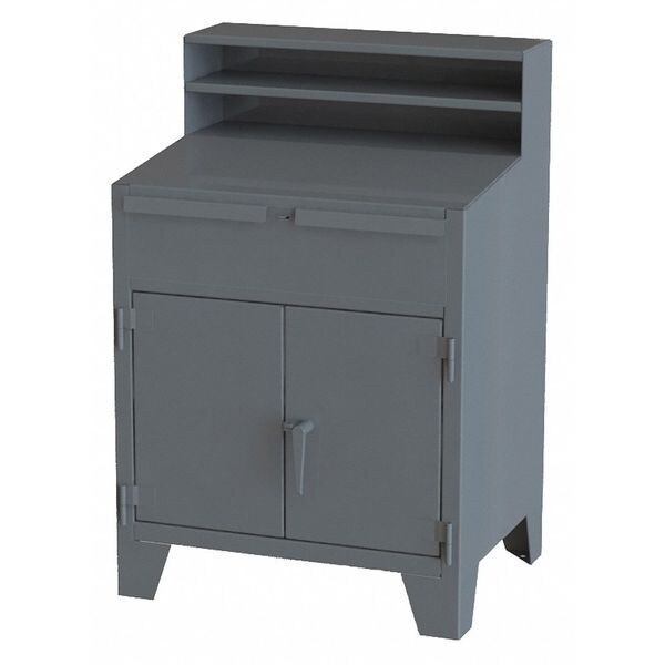 Shop Desk, Number of Doors 2, Number of Shelves 1, Desk Color Gray, Desk Style Cabinet, Includes Keyboard Tray No, Mobility Stationary, Number of Compartments 4, Number of Drawers 0, Overall Depth 28 in, Overall Height 54 in, Overall Width 36 in, Shelf Depth 24 in, Shelf Width 34 in, Panel Material Thickness 12 ga, Writing Surface Height from Ground 44 in, Writing Surface Slope 0 Degrees , Caster Type Not Applicable, Caster Wheel Diameter Not Applicable, Desk Material Steel