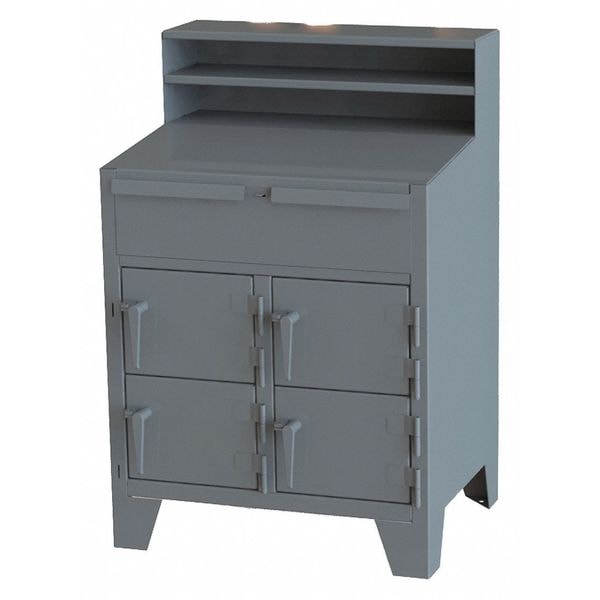 Shop Desk, Number of Doors 4, Number of Shelves 1, Desk Color Gray, Desk Style Cabinet, Includes Keyboard Tray No, Mobility Stationary, Number of Compartments 7, Number of Drawers 1, Overall Depth 28 in, Overall Height 54 in, Overall Width 48 in, Shelf Depth 24 in, Shelf Width 46 in, Panel Material Thickness 12 ga, Writing Surface Height from Ground 44 in, Writing Surface Slope 0 Degrees , Caster Type Not Applicable, Caster Wheel Diameter Not Applicable, Desk Material Steel