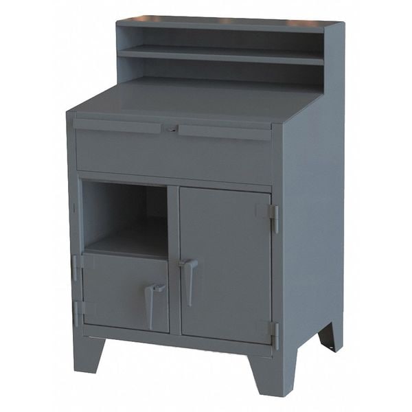 Shop Desk, Number of Doors 2, Number of Shelves 1, Desk Color Gray, Desk Style Cabinet, Includes Keyboard Tray No, Mobility Stationary, Number of Compartments 6, Number of Drawers 1, Overall Depth 28 in, Overall Height 54 in, Overall Width 36 in, Shelf Depth 24 in, Shelf Width 34 in, Writing Surface Height from Ground 44 in, Writing Surface Slope 0 Degrees , Caster Type Not Applicable, Caster Wheel Diameter Not Applicable, Desk Material Steel