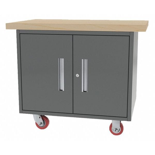 Mobile Cabinet Workbench, Top Material Butcher Block, Color Gray, Non-Metal Top Thickness 1 3/4 in, Number of Doors 2, Number of Drawers 0, Number of Shelves 2, Overall Depth 24 in, Overall Height 34 in, Overall Load Capacity 2,500 lb, Overall Width 38 in, Top Metal Material Gauge Not Applicable, Included Components Lower Shelf, Assembly Fully Assembled, Brake Type Wheel Brake, Cabinet Interior Depth 22 in, Caster Mount Type Plate, Caster Type (2) Rigid, (2) Swivel with Brakes