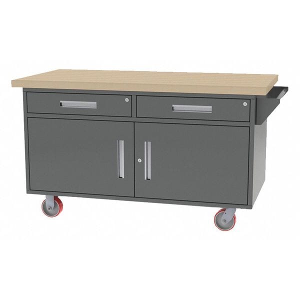 Mobile Cabinet Workbench, Top Material Butcher Block, Color Gray, Non-Metal Top Thickness 1 3/4 in, Number of Doors 2, Number of Drawers 3, Number of Shelves 0, Overall Depth 30 in, Overall Height 34 in, Overall Load Capacity 2,500 lb, Overall Width 60 in, Top Metal Material Gauge Not Applicable, Included Components Lower Shelf, Assembly Fully Assembled, Brake Type Wheel Brake, Cabinet Interior Depth 28 in, Caster Mount Type Plate, Caster Type (2) Rigid, (2) Swivel with Brakes