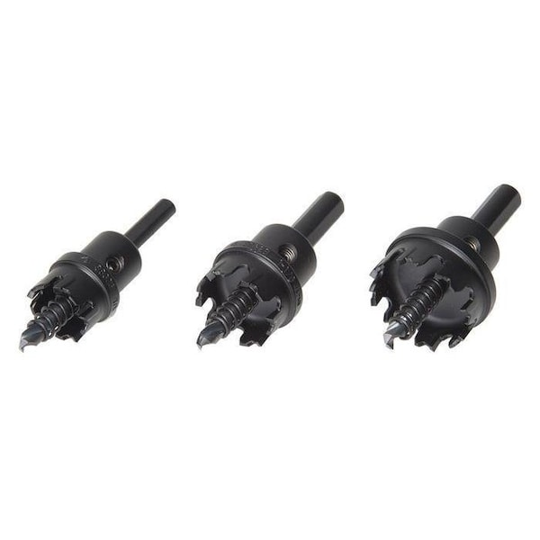 Hole Saw Kits, Hole Cutter Kit, Max. Cutting Depth 1/8 in, Arbor Design Built-In Arbor, Tooth Material Carbide Tipped, Number of Teeth 5, 6, 8, Thread Size 3/8 In., Shank Size 3/8 in, Pilot Drill Size 1/8 in dia x 5/32 in L, Replacement Pilot Drill No. Mfr. No. 625-001, 625-002, Application Metal Cutting, Includes Hex Key, Pilot Drill Bit, Plastic Carrying Case