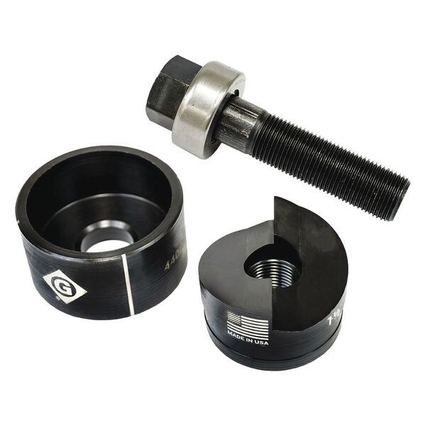 Knockout Punch, Standard Round, Hole Size Nominal 1.953 in, Hole Size (In.) 1.951, Conduit and Pipe Size (In.) 1-1/2, Number of Pins 0, Max. Capacity Mild Steel (Ga.) 10, Slug Splits in Half, Falls Free from Die and Stud, Centering Marks For Hole Alignment, For Punching Holes in Mild Steel, Aluminum, Fiberglass or Plastic, Use With Greenlee Manual, Hydraulic, and/or battery operated knockout drivers