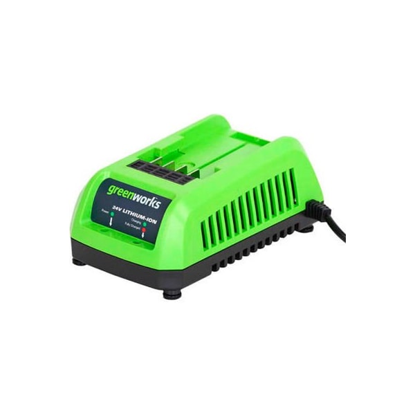 Greenworks 29862 g-24 lithium-ion battery charger, 24v greenworks 2g-24 charger charges 2 ah batteries in 45 minutes.