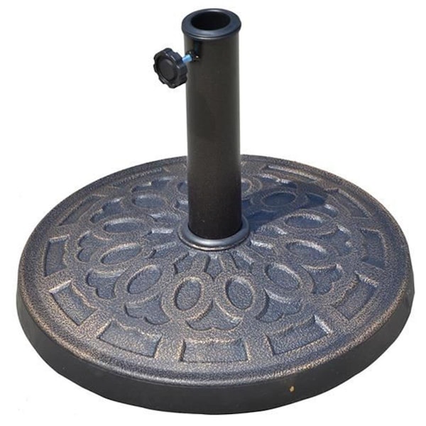 This poly resin umbrella base gives a decorative high end touch to your outdoor living space while also performing a necessary task of holding your umbrella in place. With an attractive decorative spiral pattern and bronze finish this piece adds charm and elegance to any patio. Made from poly resin this piece is rust-resistant and made to last for years. Set up your outdoor patio today with a beautiful umbrella and keep it secure with an umbrella base. Features -Includes a coupler to allow it to fit both 1.5in and 2in diameter umbrella poles -Includes a hand-turn knob for securing umbrella to the base -Made of poly resin material -Bronzed finish Specifications - Color: Bronze - Size: 17in - Weight: 26 lbs