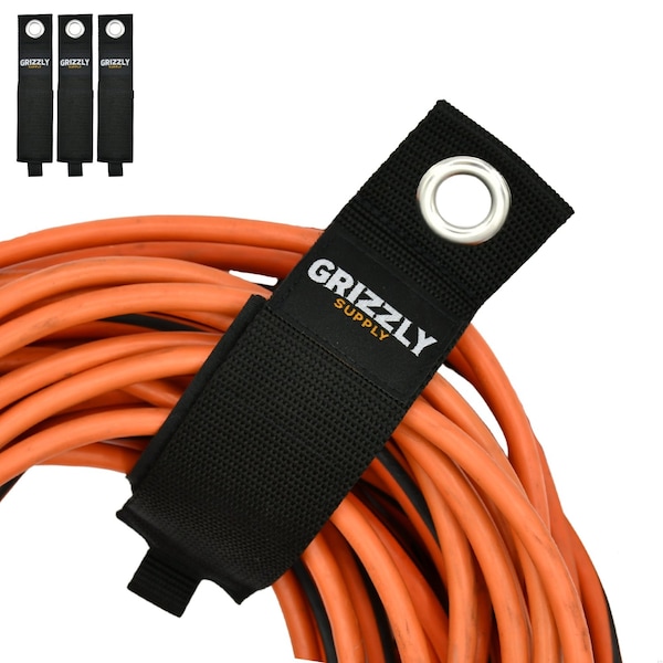The 17" Black Hook & Loop Storage Strap provides a robust organizing solution with added utility. These storage straps are equipped with a metal grommet, allowing users to not only bundle items but also hang them for vertical storage and easy access. This Grizzly Supply product is 17 in long and 2 in wide. It features a tensile strength of 264.6 lbs (120kgs). Made from Polypropylene webbing and Nylon Velcro with a metal grommet, it is built for the heaviest tasks. The color is Black. It is designed for both indoor and outdoor use. This product is sold in a pack of 2.