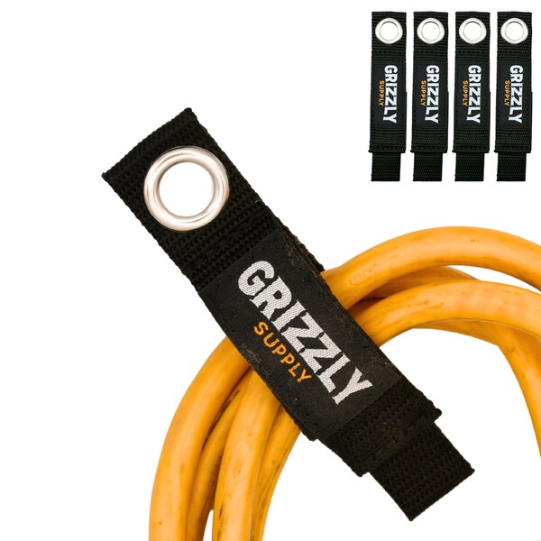 The 7" Black Hook & Loop Storage Strap provides a robust organizing solution with added utility. These storage straps are equipped with a metal grommet, allowing users to not only bundle items but also hang them for vertical storage and easy access. This Grizzly Supply product is 7 in long and 1 in wide. It features a tensile strength of 17.6 lbs (8kgs). Made from Polypropylene webbing and Nylon Velcro with a metal grommet, it is durable and reliable. The color is Black. It is designed for both indoor and outdoor use. This product is sold in a pack of 4.
