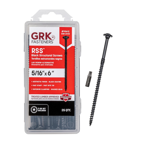 GRK RSS Black Structural Screw is a structural fastener designed for ease of installation and the strongest of connections while providing a bold finish. With proprietary features like the Zip-Tip, and W-Cut thread, RSS fasteners drive into most woods without the need for pre-drilling. The specially engineered design results in a low-effort installation, especially compared to conventional lag screws. RSS Rugged Structural Screws have a Climatek Coating for installation in both interior and exterior conditions where exposure to moisture is intermittent and is code-approved for use in treated lumber. threads and point bite instantly into material including hardwood, reducing the splitting effect caused by smaller shanks. Its washer type head has no sharp edges like conventional lag screws and the added shoulder underneath the washer has the ability to center the RSS screw in predrilled hardware.