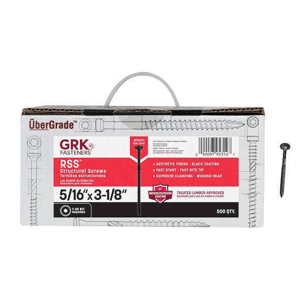 The GRK RSS Rugged Structural Wood Screw is a professional-grade fastener designed for heavy-duty framing, decking, and construction projects. These premium screws deliver superior performance in applications, including deck building, timber framing, laminated beams, pole barns. GRK’s Black Climatek coating, provides exceptional corrosion resistance, making these construction screws ideal for pressure-treated lumber, cedar, and all other wood applications. The patented Fast Bite Tip and Zip-Tip technology eliminates the need for pilot holes, while the W-Cut design ensures smooth, low-torque driving in all wood types. ICC-ES ESR-2442 approved for structural applications, these self-drilling screws are trusted by professional builders and DIYers alike. The star drive head with 6-points of contact prevents cam outs and head stripping, making these wood screws the choice for demanding construction and home improvement projects.