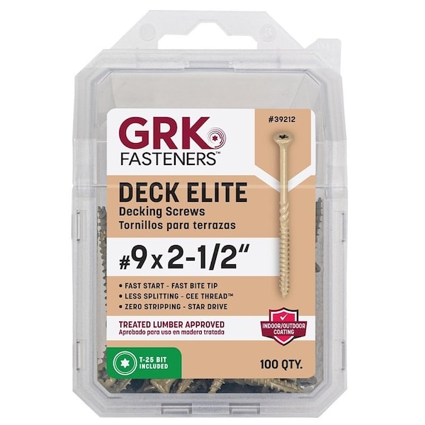 GRK's Deck Elite screws are designed for use in wood deck boards and provide a quick drive and clean finish. Deck Elite screws start immediately in wood with a smooth, fast drive to increase productivity on the job and the tan color of the screw provides an ideal finish.