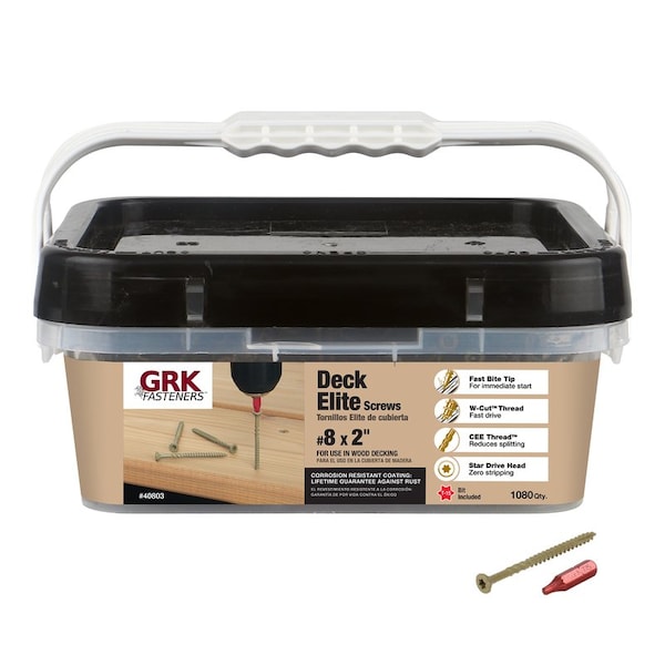 GRK Deck Elite delivers superior productivity with its Fast Bite Tip and patented W-Cut thread form for a quick start and easy drive. The CEE-thread ensures a successful drive with no wood splitting and reduces friction/heat buildup on the screw, resulting in elimination of head pops. Pros and homeowners alike will enjoy the ideal aesthetic of a clean, finished look with Deck Elite’s color match.
