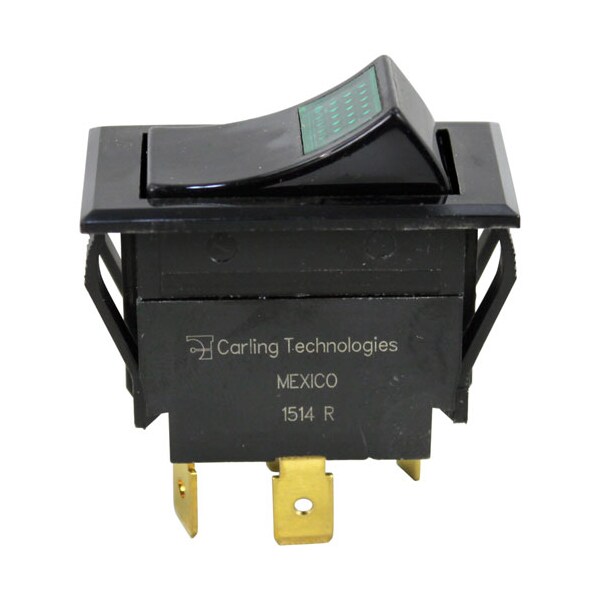 [ Lighted Rocker Switch] [ Fits Hole 7/8" X 1-1/2" ]; [ On/Off ] [ Spdt ] [ Terminals 4 (1/4" Tabs) ]; [ Amp/Volt 15A/125-277V ] 3/4 Hp,;[ Color Green Light/Black Body];Groen Oven Cc10-G, Cc20-G;Steamer Hy-6G